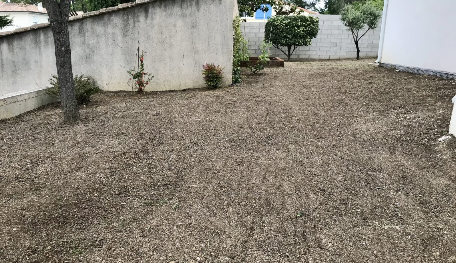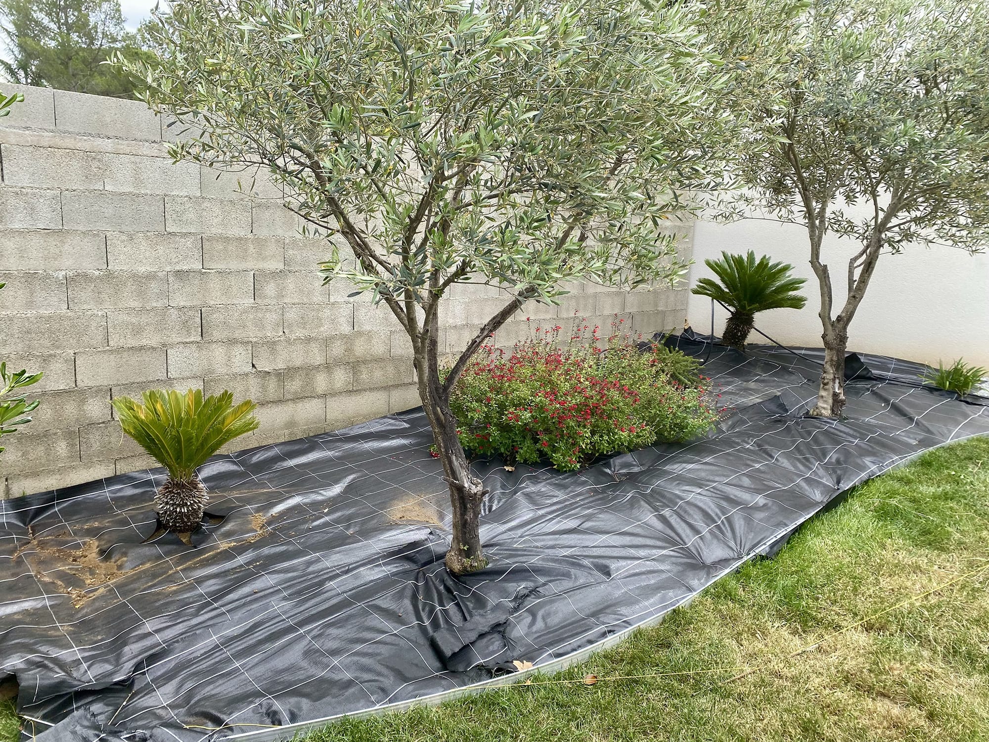 Après avoir préparé le sol pour le gazon, nous avons opté pour un mélange de graines adapté à la région sèche du sud de la France. Ce choix permettrait d’obtenir un gazon verdoyant et esthétiquement plaisant tout en devenant moins exigeant en eau au fil des ans. Les zones destinées à recevoir un paillage ont été préalablement recouvertes d’un géotextile pour empêcher la croissance des mauvaises herbes, puis garnies de graviers soigneusement sélectionnés.