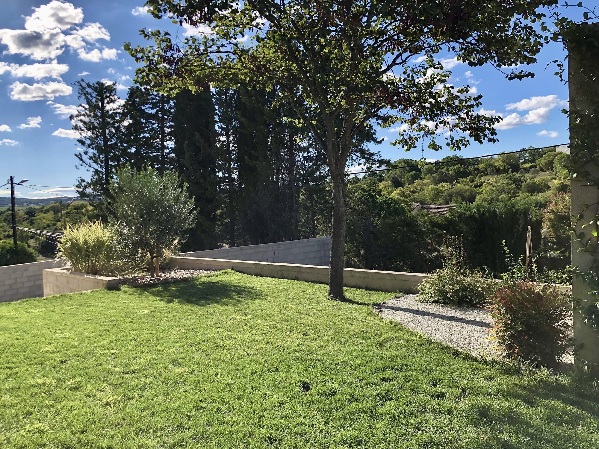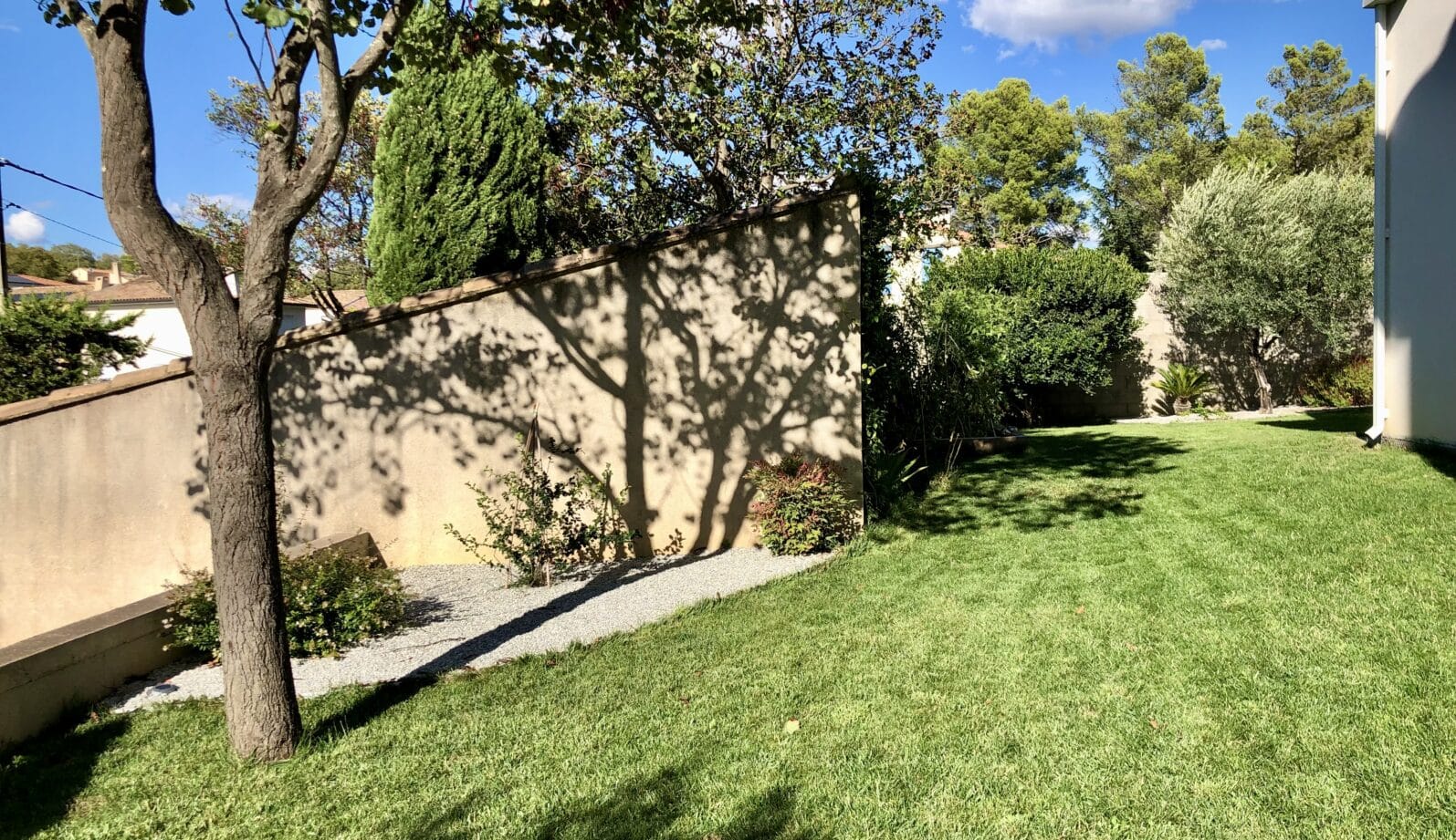 Pour dissimuler rapidement les murs mitoyens disgracieux, nous avons proposé une solution ingénieuse : végétaliser le mur en utilisant du jasmin étoilé. Ce végétal a une croissance rapide s’il est bien planté et bien entretenu. Ainsi, il a le double avantage d’apporter un résultat quasi immédiat avec très peu de prise au sol contrairement par exemple à des haies de cyprès. Il demande également beaucoup moins d’entretien et permet de profiter de feuillages toute l’année et d’une floraison blanche très esthétique et odorante. Des fils de tension ont été installés sur les murs pour soutenir la croissance de cette plante grimpante.