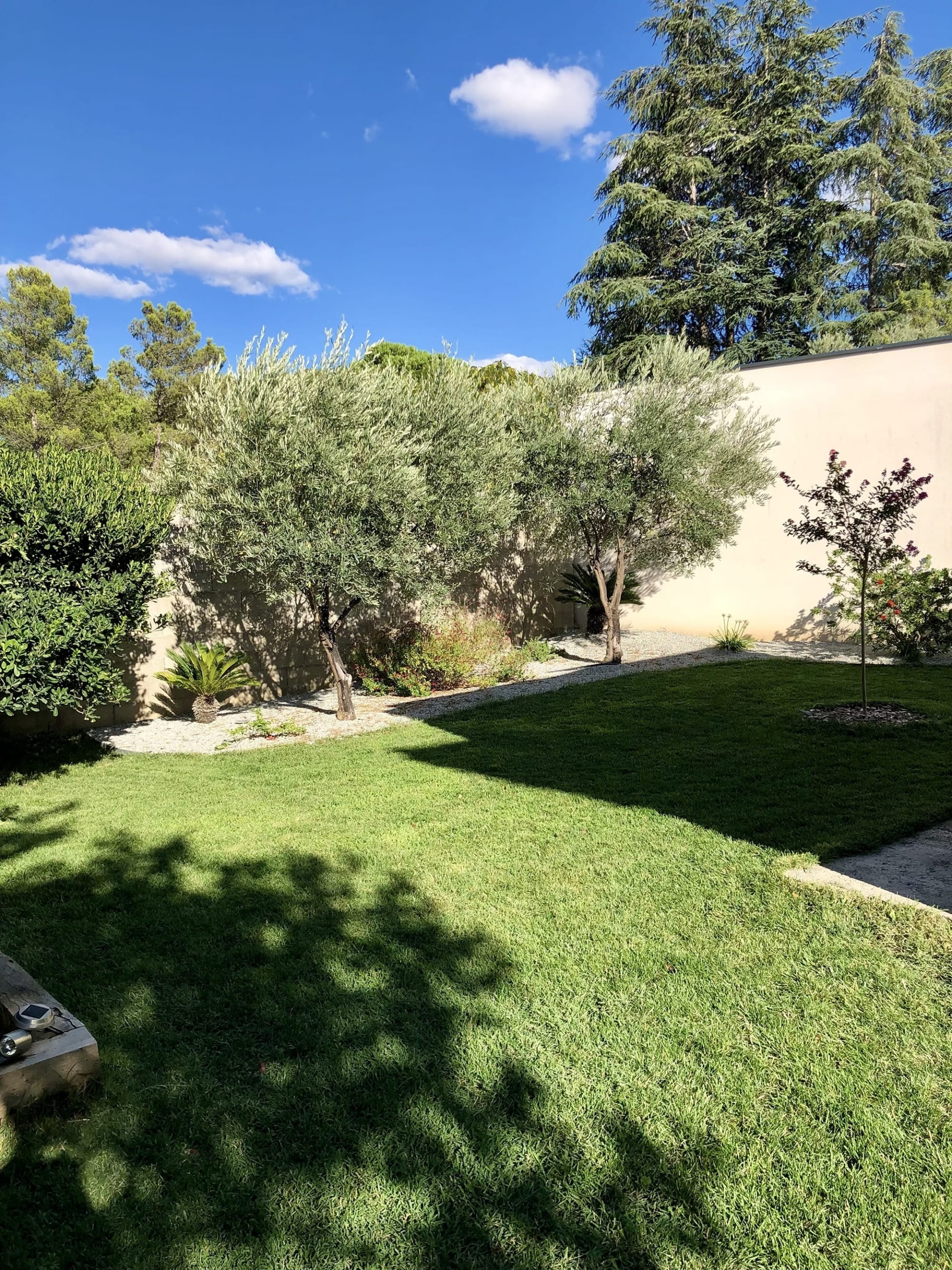 Le résultat final est un jardin moderne, esthétique et facile d’entretien, parfaitement adapté aux contraintes du terrain et du climat régional. Le projet a été réalisé en 2021. Après seulement deux ans, le jasmin étoilé a gracieusement recouvert les murs mitoyens, offrant une verdure agréable face à l’entrée de la maison et une superbe floraison blanche en saison. Les plantations ainsi que le gazon se sont bien développés, témoignant de notre savoir-faire. Après avoir été arrosé tous les jours lors de sa plantation, le gazon ne nécessite plus désormais que 3 arrosages par semaine et il offre une belle couverture verte.
