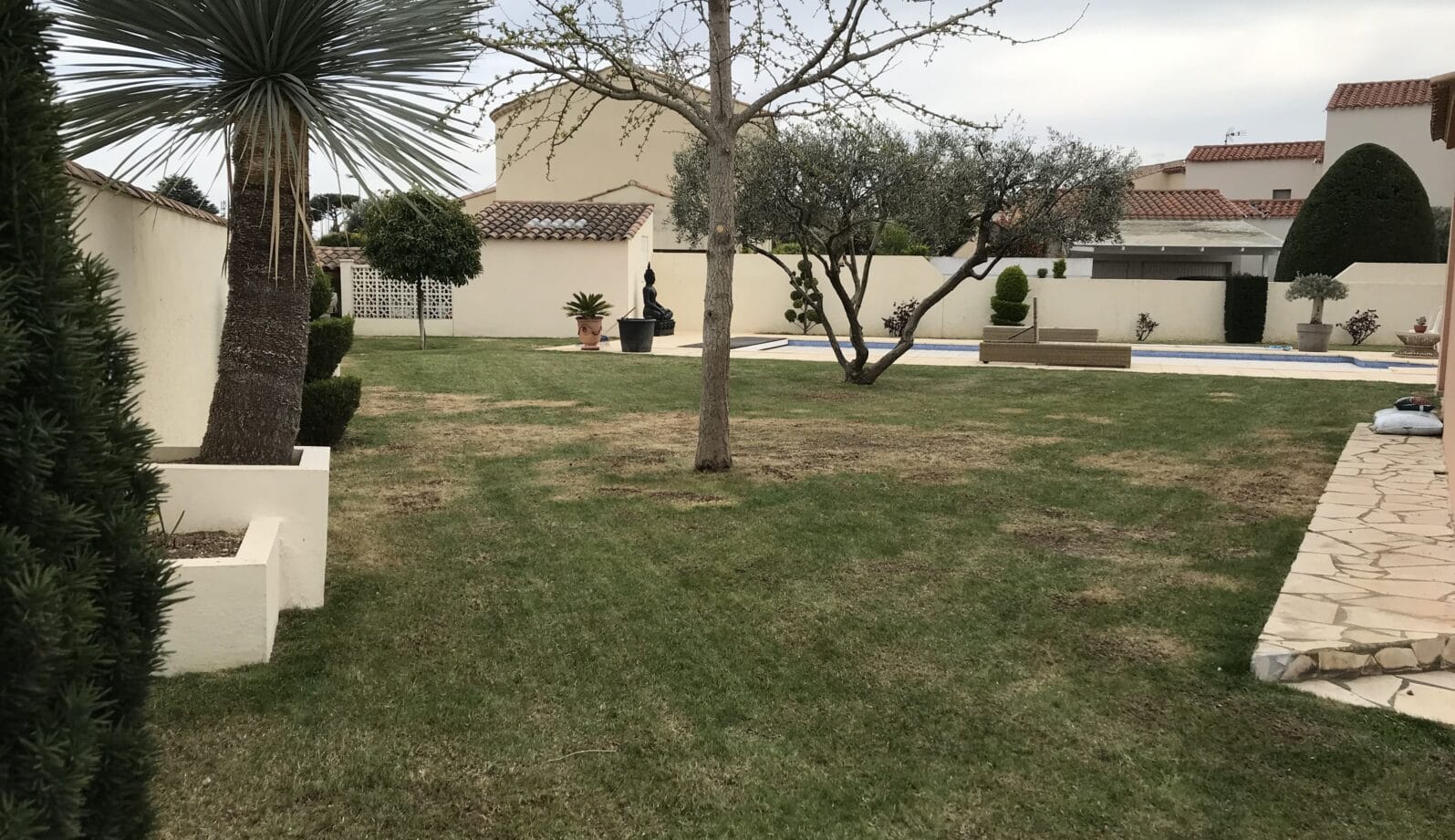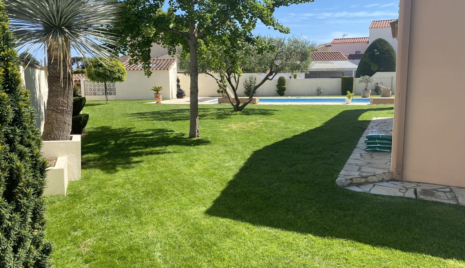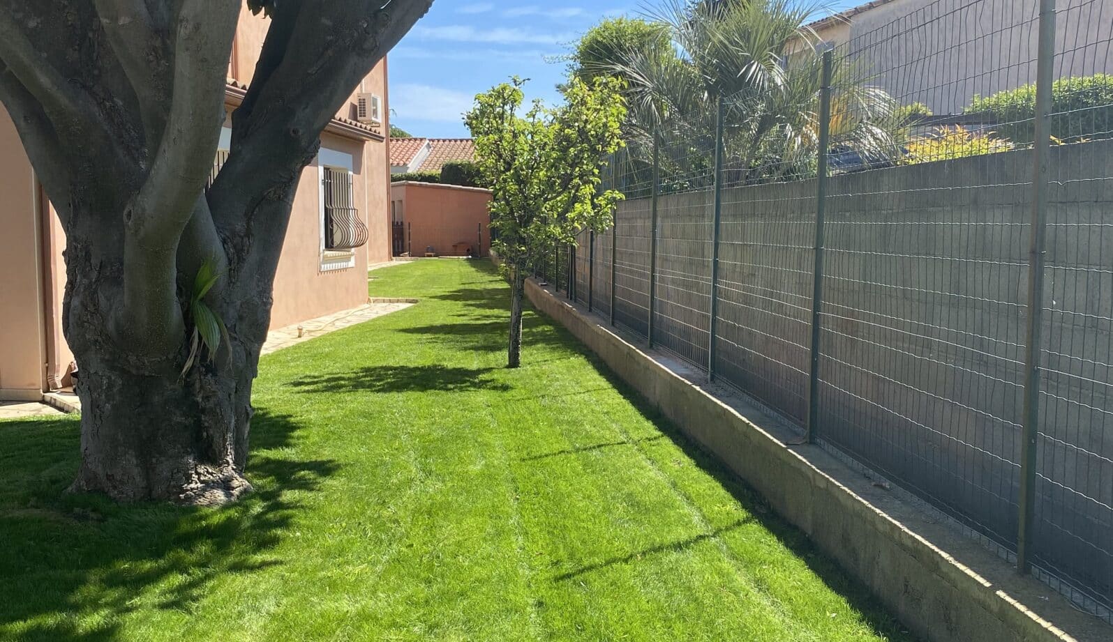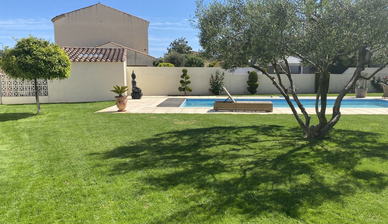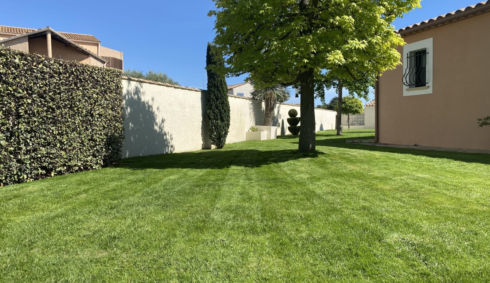 La rénovation de ce jardin à Pérols a consisté à redonner vie à une pelouse défraîchie et à corriger un système d’arrosage automatique inefficace pour une propriété avec piscine. Après avoir conseillé au client d’attendre le début du printemps pour garantir une pousse optimale, le projet s’est articulé autour du nettoyage complet du sol (scarification manuelle, retrait de la mousse et des herbes mortes) et d’une restructuration technique du réseau d’arrosage pour supprimer les zones sèches et les gaspillages d’eau.